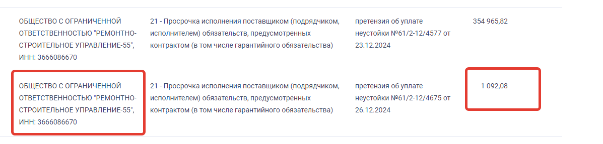 Руководство ООО «РСУ-55» в отношении областных властей, да и того же минстроя, повело себя не совсем хорошо: имея аванс в десятки миллионов рублей, компания ни копейки не заплатила штрафов (их общая сумма не более 3 млн рублей), которые ей выписал заказчик. Кстати, такое поведение подрядной организации было и в отношении другого госконтракта от минстроя: последний выплатил ООО «РСУ-55» аванс не менее 60 млн рублей для выполнения работ на другом объекте, срок выполнения работ там тоже сорван почти на два года, а подрядчик не спешит оплачивать выписанный ему штраф (неустойку) в сумме 1 тысячи 92 рублей и 8 копеек.
