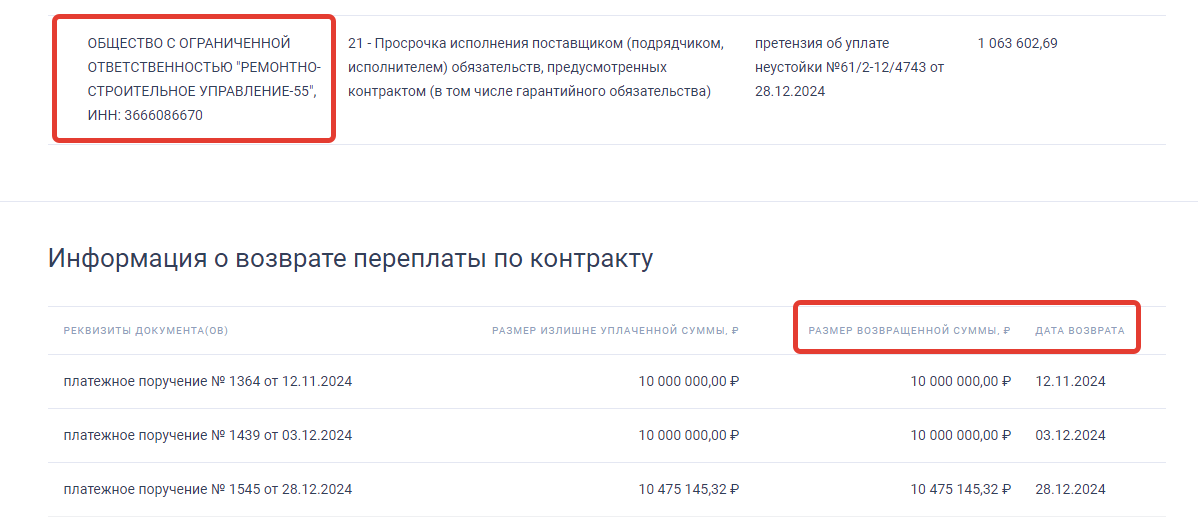 Финансовые санкции от минстроя последовали с большим опозданием - с ноября по декабрь 2024 года. Тремя платежными поручениями было возвращено 30,4 млн рублей, которые неэффективно (для облбюджета) использовались строителями. Тогда же минстрой снизил цену госконтаркта со 150 млн рублей до 138 млн., как записано в допсоглашении №6.
