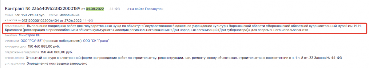 В данном случае речь идет о выполнении подрядных работ по сохранению объекта культурного наследия «Государственное бюджетное учреждение культуры Воронежской области «Воронежский областной художественный музей им. И. Н. Крамского», расположенного на проспекте Революции, 22.