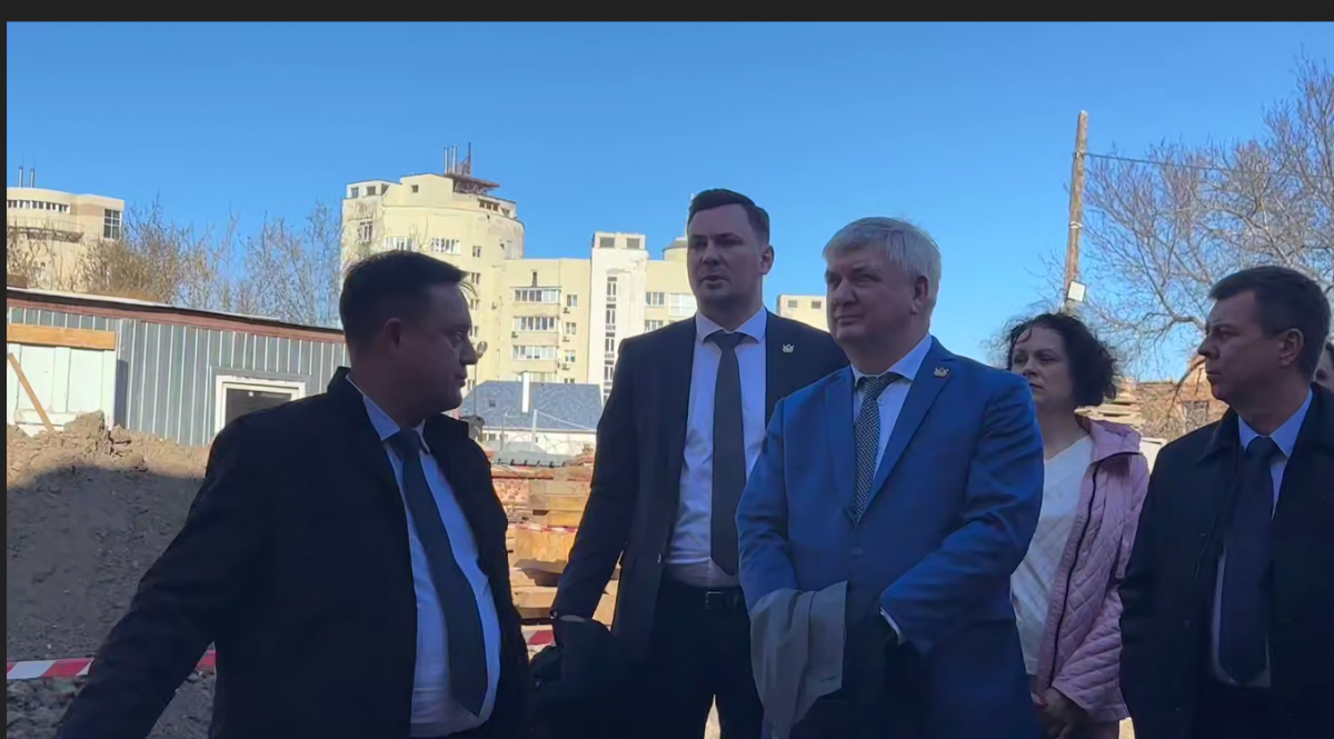 скриншот из видео ТГ канала Гусев, посторонние лица на стройке ходят без соблюдения правил безопасности, им даже не дали строительные каски, наверное, их вообще нет на объекте, а министр Кулешов (справа от губернатора) даже формально не позаботился о безопасности первого лица.