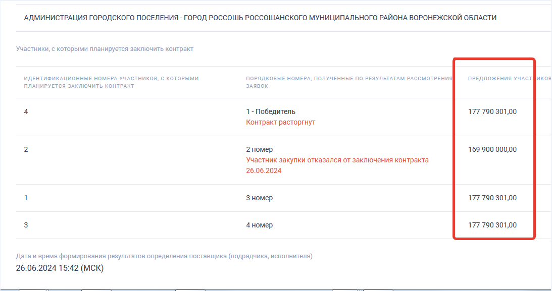скриншот сайта госзакупок, у трех участников одинаковое ценовое предложение - до копейки.