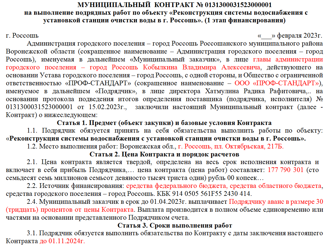 Что касается первого контракта - реконструкции системы водоснабжения с установкой станции очистки воды в городе Россошь – то мэрия в марте 2023 года выплатила подрядчику аванс (30 процентов от цены контракта) на сумму 53,3 млн рублей. Однако эти бюджетные деньги ООО «Проф-Стандарт» полностью не отработал.
