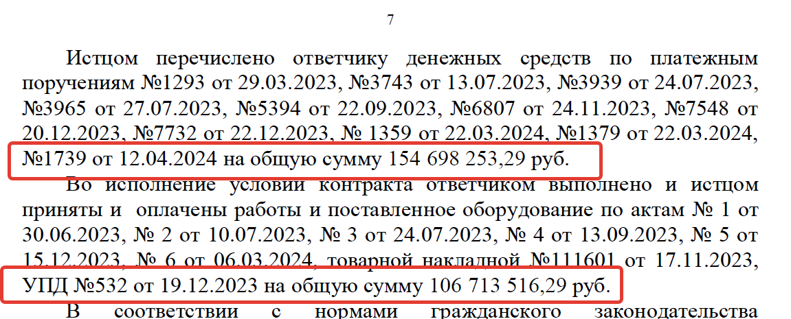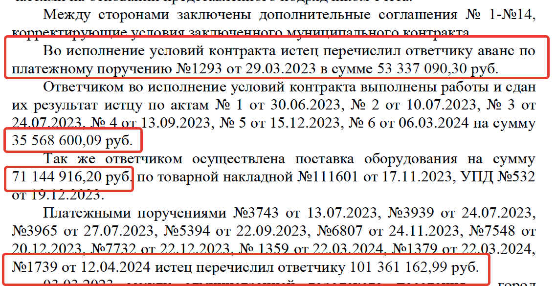 Далее, как следует из материалов судебного дела, для выполнения работ подрядчик приобрел и осуществил поставку оборудования (в конце 2023 года) на сумму 71,1 млн рублей.