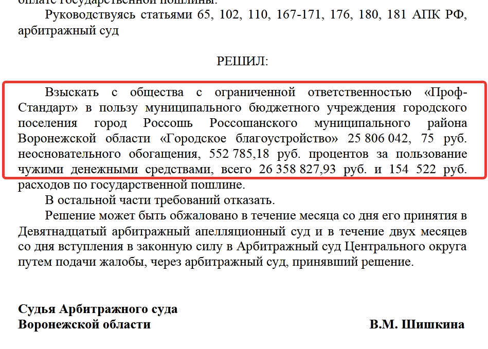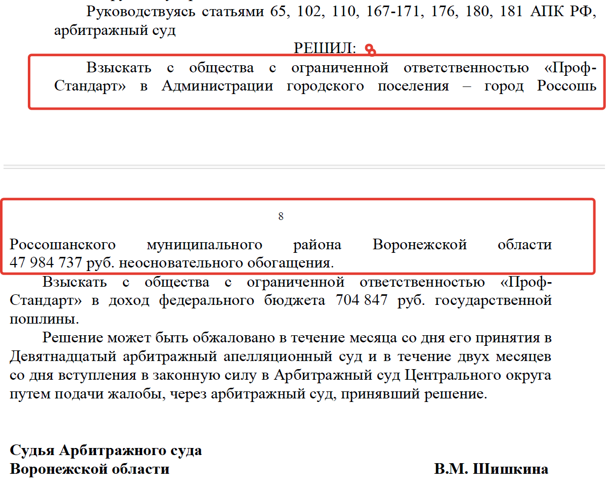 А еще через месяц, в июне, мэрия Россоши, как организатор и заказчик тех торгов, подала исковое заявление в Арбитражный суд. В нем она требовала взыскать с ООО «Проф-Стандарт» 47,9 млн рублей. Это деньги, которые не отработал подрядчик.