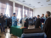Чин освящения был совершен в актовом зале. Митрополит с преподавателями, студентами и гостями совершил молебен. После него Владыка окропил святой водой зал и учебные аудитории.