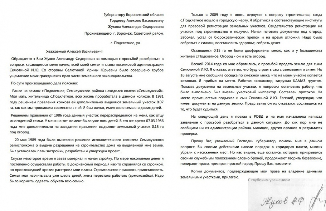 Александр Жуков давно живет в Подклетном, воспитал пятерых детей и имеет в собственности два земельных участках. В 1989 году райисполком Семилукского района принял решение выдать Александру разрешение на строительство дома, был разработан план застройки. Когда мужчина начал строиться, к нему неожиданно подошла, по его словам, глава Подклетного Ирина Селютина.