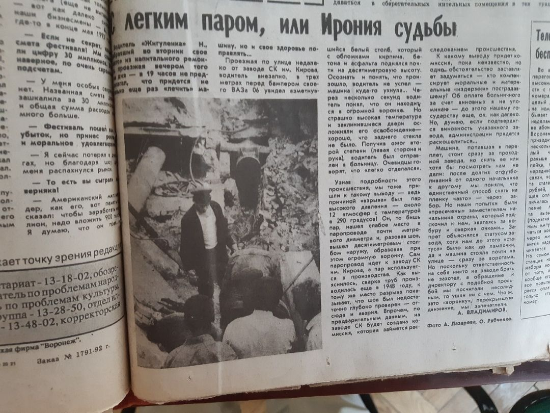- Узнав подробности этого происшествия, мы тоже пришли к такому выводу – ведь причиной «взрыва» был пар высокого давления – около 12 атмосфер с температурой в 290 градусов! Он, то бишь пар, нашел слабое место в паропроводе почти метрового диаметра и, разломив шов, вышел десятиметровым столбом наружу, образовав при этом огромную воронку. Сам паропровод идет к заводу СК им. Кирова, а пар используется в производстве. Как выяснилось, сварка труб производилась еще в 1948 году, к тому же место разрыва показывает, что шов был недостаточно глубоко проварен – отсюда и авария, - писал в 1992 году журналист газеты «Утро» А. Владимиров.