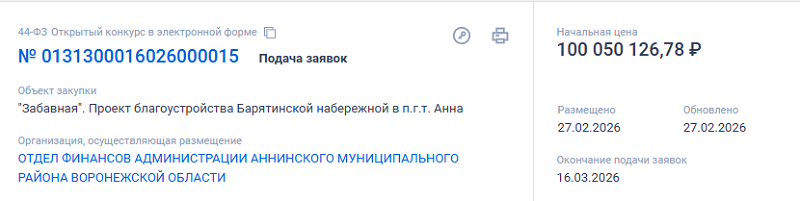 В системе Госзакупок появился тендер на благоустройство Барятинской набережной в поселке Анна Воронежской области. Торги на понижение с потенциальными подрядчиками начинаются с суммы в 100 миллионов 50 тысяч рублей. К тендеру приложена достаточно подробная смета, по которой можно проследить, куда планируют направить деньги.