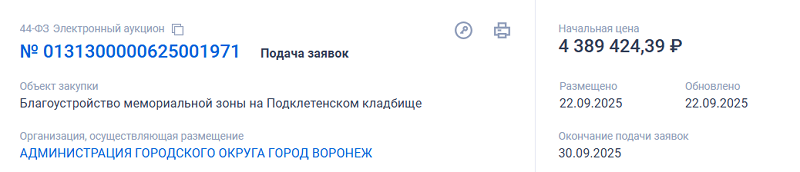Срок, за который необходимо выполнить работы – 30 дней с момента заключения контракта. Заказчиком выступает мэрия Воронежа, а заявки от подрядчиков принимаются до 30 сентября. Примечательно, что в списке воронежских кладбищ нет кладбищ с названием «Подклетенское». Но неподалеку от деревни Новоподклетное есть Подгоренское кладбище, на территории которого есть мемориал (воинское захоронение).