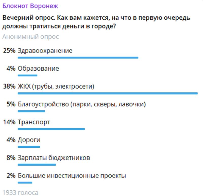 В мини-исследовании поучаствовали 1933 человека. Вопрос был сформулирован следующим образом – на что в первую очередь должны тратиться деньги в городе? В качестве вариантов ответа предложили самые крупные статьи расходов – образование, здравоохранение и так далее. Выбрать можно было только что-то одно. Результаты получились такими: