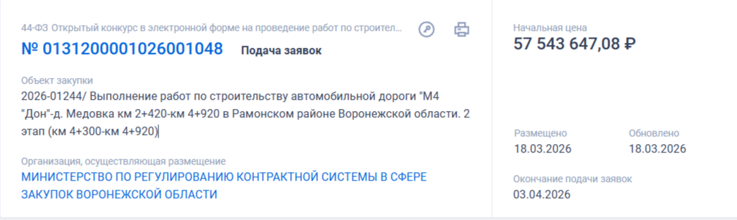 В системе Госзакупок появился тендер на строительство автодороги М-4 «Дон» - Медовка в Рамонском районе Воронежской области. Это будет уже второй этап строительства. Торги с подрядчиками на понижение начнутся с суммы в 57,5 млн рублей. В описании объекта закупки говорится, что строительная длинна составит 1 км 96 метров, покрытие будет капитального типа из асфальтобетона.
