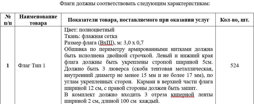 Еще условия. Обшивка по периметру армированными нитками должна быть исполнена двойной строчкой. Левый и нижний края флага должны быть укреплены стропой шириной в пять сантиметров. Должно быть 3 люверса (скоба тентовая металлическая, внутренний диаметр не менее 15 мм и не более 17 мм), по углам укрепленных сторон. В верхней части флага нужно сделать карман шириной 12 см и с правой стороны зашить его. В комплект к флагу приложить три отреза киперной ленты по сто сантиметров каждый.