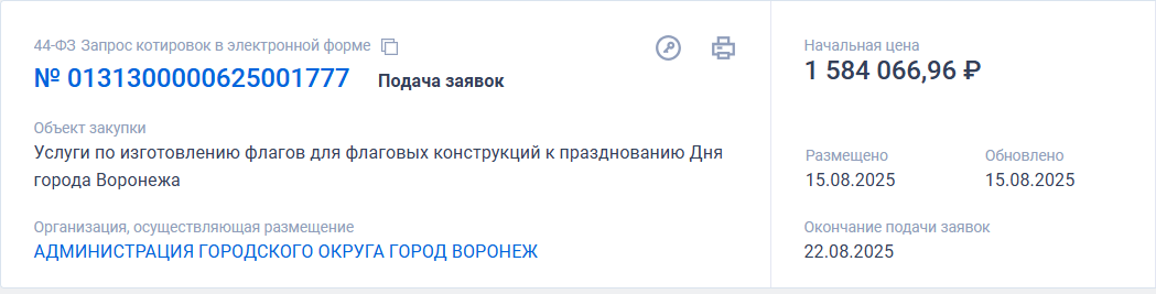 Все это добро нужно успеть привезти заказчику на улицу 9 Января к десятому сентября. В качестве заказчика выступает мэрия Воронежа. А заявки от подрядчиков принимаются до 22 августа.