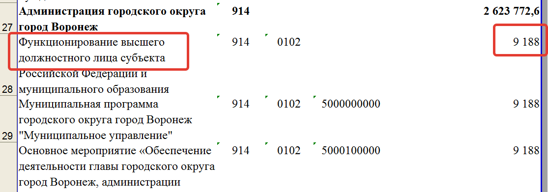 скриншот из декабрьского (2024-го года) Решения Воронежской гордумы об утверждении бюджета Воронежа на 2025 год, на мэра "дают" 9 млн 188 тысяч рублей