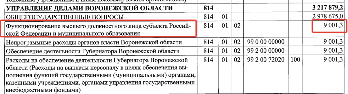 скриншот из закона Воронежской области "Об исполнении бюджета за 2024 год", на губернатора денег потратили меньше, чем на мэра Воронежа