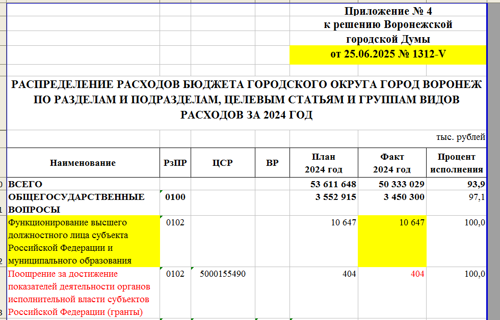 скриншот из Решения Воронежской городской Думы об Исполнении бюджета города за 2024 год