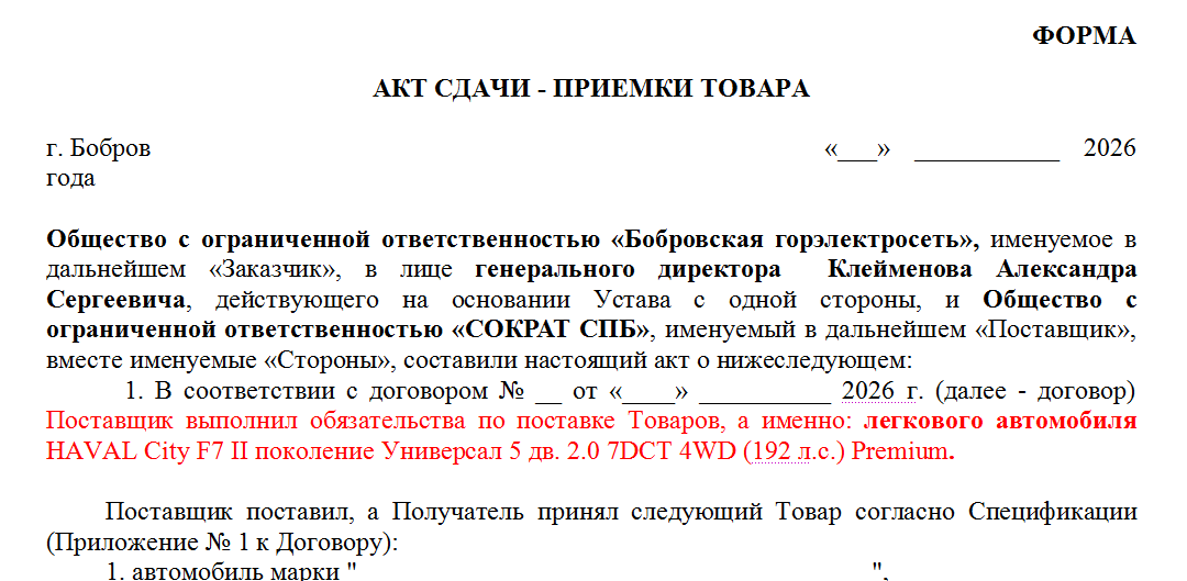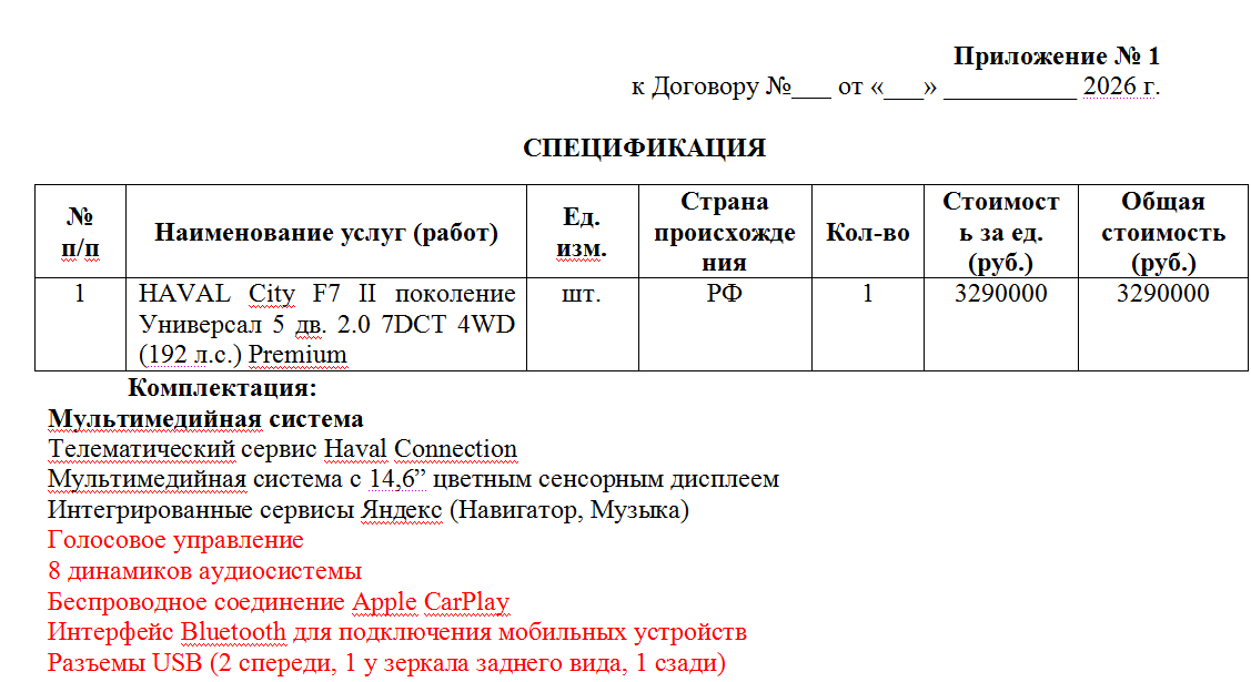Что касается китайского кроссовера HAVAL City F7 II, то в открытых источниках сообщается: его сборка может осуществляться в Туле, а значит, позволяет учитывать особенности нашего климата и качество дорог. Цвет кузова в контракте не указывается. Срок договора между сторонами действует до 28 февраля 2026 года.
