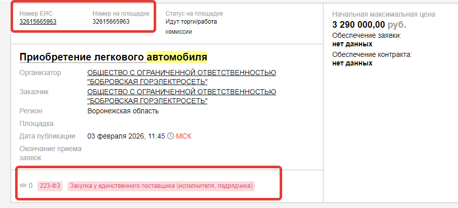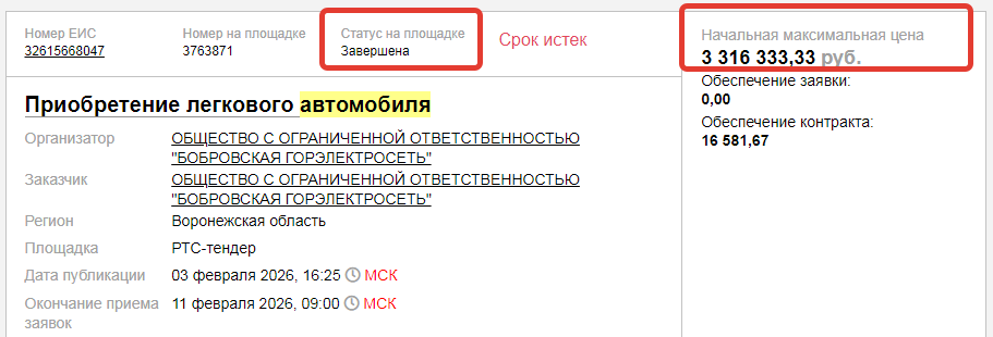 скриншот сайта госзакупок, информация о проведении ООО «Бобровская горэлектросеть» вторых февральских торгов на покупку легкового автомобиля, его заявленная стоимость - 3 млн 290 тыс рублей - отличается от первой закупки