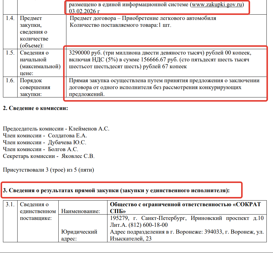 Протокол к этой закупке значится от 3 февраля, то есть от того дня, когда на сайте появилась информация о торгах ООО «Бобровская горэлектросеть» на покупку легкового автомобиля за 3 млн 290 тысяч рублей. Удивительно или нет, но единственным исполнителем этой прямой закупки оказалось уже известное ООО «Сократ СПБ», с его подразделением в Воронеже. Вот что об это сообщается в опубликованном протоколе от 3 февраля.