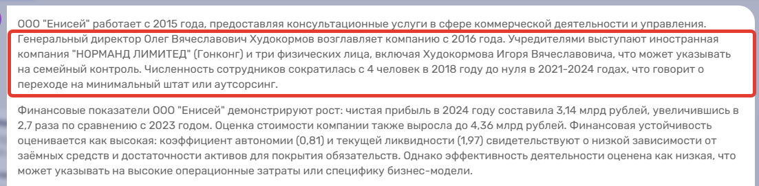Кстати, Олег Худокормов, руководитель этого ООО, имеет порядка шести организаций. Их показатели за 2024 год, судя из открытых источников, таковы: 7 сотрудников, выручка всех организаций в прошлом году упала на 75% и составила 9,6 млрд рублей, а прибыль - 13 млрд. И это - работа всего семи сотрудников.