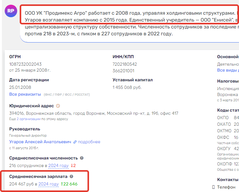 Интересно, что учредителем ООО «Управляющая компания «Продимекс Агро» является, судя по открытым данным, ООО «Енисей», у которого юридический адрес – город Воронеж. У этой организации еще в 2020 году среднемесячная зарплата была под 404 тысячи рублей, а в прошлом году не было сотрудников.