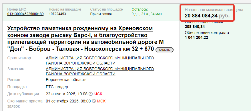 Как следует из открытых данных, сегодня разведением лошадей, ослов, мулов занимается предприятие АО «Хреновской конный завод», которое расположено в Бобровском районе, в селе Слобода. А финансовые показатели этой организации за 2024 год таковы – размер прибыли 283 млн рублей. А раз это так, то почему коммерсанты не могут или не хотят хоть частично оплатить закупку материалов или работы по созданию скульптурной композиции рысаку «Барс 1»?
