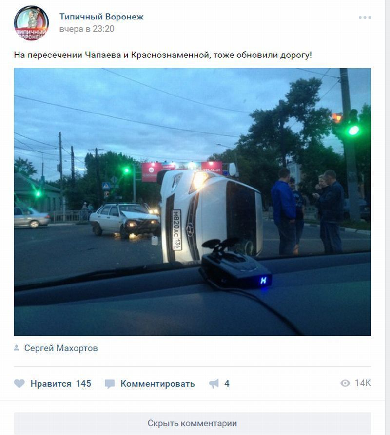 Поздно вечером 8 июля в популярном воронежском сообществе появилась фотография аварии в Ленинском районе города. На изображении был показан автомобиль «Хенде Солярис», который перевернуло набок. За ним стоит ВАЗ-21099 с помятым передом. Авария произошла на перекрестке улиц Чапаева и Краснознаменной.