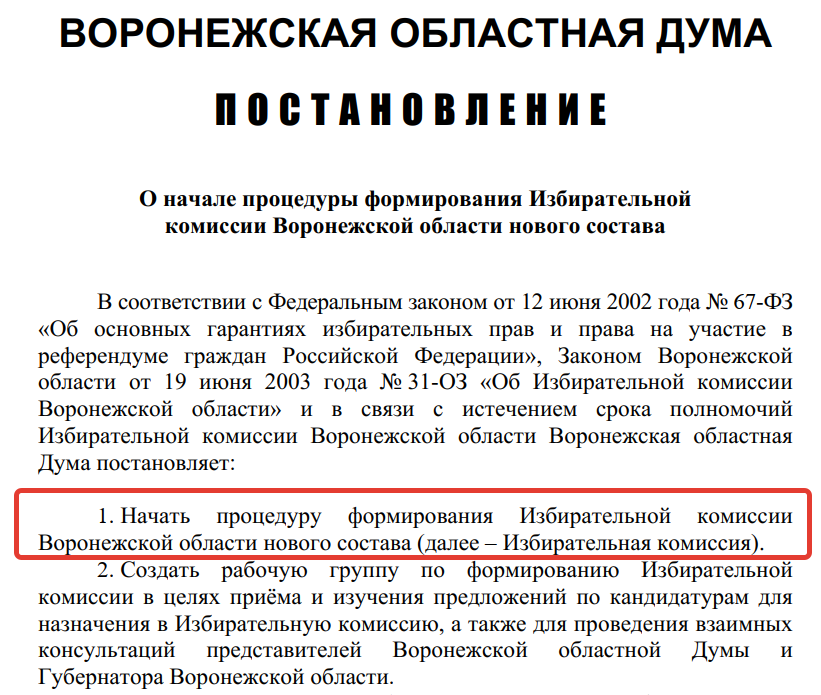 Это процедура связана с тем, что у нынешнего состава облизбиркома заканчивается пятилетний срок полномочий. Согласно региональному закону «Об избирательной комиссии Воронежской области», решение о начале процедуры формирования комиссии нового состава принимается Воронежской облдумой и губернатором, а срок приема предложений по кандидатурам составляет 30 дней.