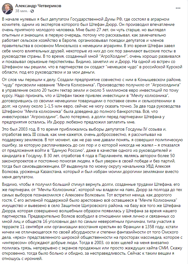 - В начале нулевых я был депутатом Государственной Думы РФ, где состоял в аграрном комитете, одним из экспертов которого был Штефан Дюрр, - вспоминает на своей странице в Фейсбук Александр Четвериков. - Он производил впечатление очень приятного молодого человека. Мне было 27 лет, он чуть старше, но выглядел опытным и знающим, в первую очередь, потому что рассказывал, как замечательно работает сельское хозяйство в Европе, организовывал поездки депутатов и членов правительства в основном Минсельхоз к немецким аграриям. В это время Штефан завёл себе много влиятельных друзей, некоторые из них до сих пор занимают высокие посты в руководстве страны. Созданный мной «Агрохолдинг», очень хорошо развивался и показывал серьезные перспективы. Видимо, заметил их и Дюрр. На одной из встреч со Штефаном мы решили, что в партнёрстве он создаст «немецкое чудо» в российской Курской области, под его руководством и за мои деньги. От слов мы перешли к делу. Создали предприятие совместно с ним в Конышевском районе, «чуду» присвоили название «Мечта Колхозника». Производство получило от «Агрохолдинга» в управление около 20 тысяч гектар земли и около 5 миллионов евро инвестиций по тому курсу. Надо признать, что и Штефан также привлек инвестиции в «Мечту колхозника», договорившись со своими немецкими товарищами о поставке семян и сельхозтехники в долг, на сумму около 1-1,5 млн евро, сейчас не могу сказать точно. За два года руководства Штефаном «Мечта колхозника» была доведена до полного банкротства. Всё, что инвестировал «Агрохолдинг», было потеряно, а долги перед партнёрами Штефана у предприятия остались. Их Дюрр любезно предложил заплатить мне. Это был 2003 год…