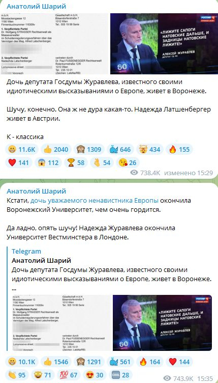 На днях популярный украинский блогер Анатолий Шарий, который яростно критикует киевскую хунту, сделал заявления о депутате Госдумы Алексее Журавлеве, родившемся и выросшем в Воронеже. Точнее слова медиадеятеля были посвящены дочери народного избранника Надежде Латшенбергер. Шарий с присущим ему сарказмом заявил, что дочь Журавлева «не дура», и поэтому она не живет в Воронеже. А проживает Надежда якобы в Австрии.