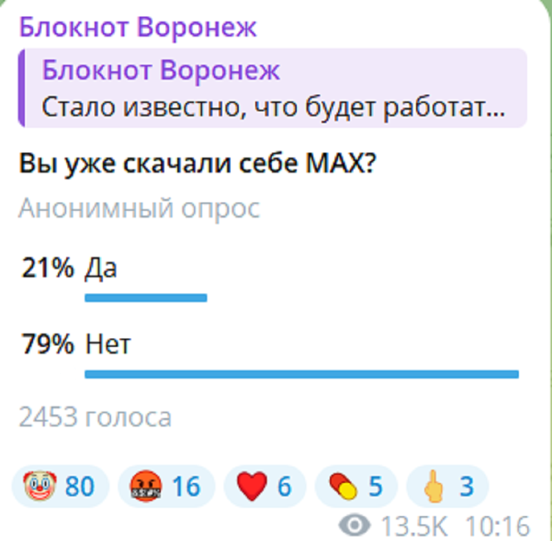 В голосовании приняли участие почти 2,5 тысячи наших читателей. 21% заявил, что скачал месседжер МАХ, 79% этого не сделали.