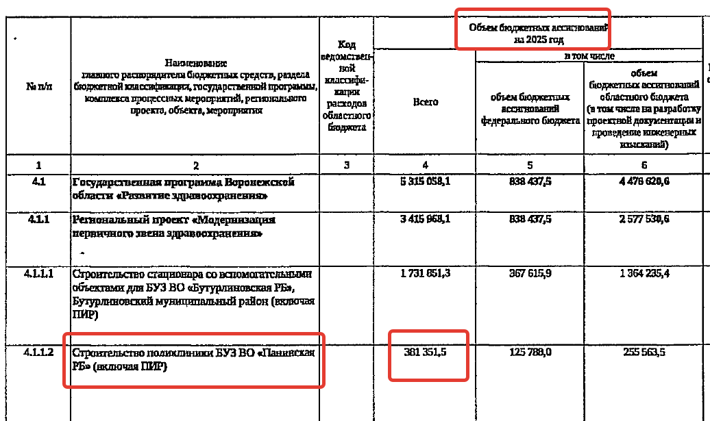 Кстати, в минувшем году объем бюджетных ассигнований на этот объект в Панино составил: 125,7 млн рублей - это федеральные срседства, а областных – 255,5 млн. Всего было выделено 381,3 млн. Такие данные содержатся в постановлении облправительства «Областная адресная инвестиционная программа по объекта государственной (областной) собственности на 2025 год». Документ был подписан 24 декабря прошлого года, то есть в нем должны были быть учтены все «финансовые потоки», в том числе и федеральные средства на строительство поликлиники в Панино.