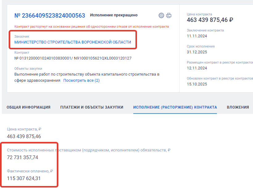 Что же касается истории с первым подрядчиком на строке поликлиники в Панино, то им было ООО «ЖБИ-Капстрой». Контракт на 310 млн рублей был заключен в мае 2024 года, а уже в июле, то есть через два месяца, - расторгнут со стороны подрядчика.