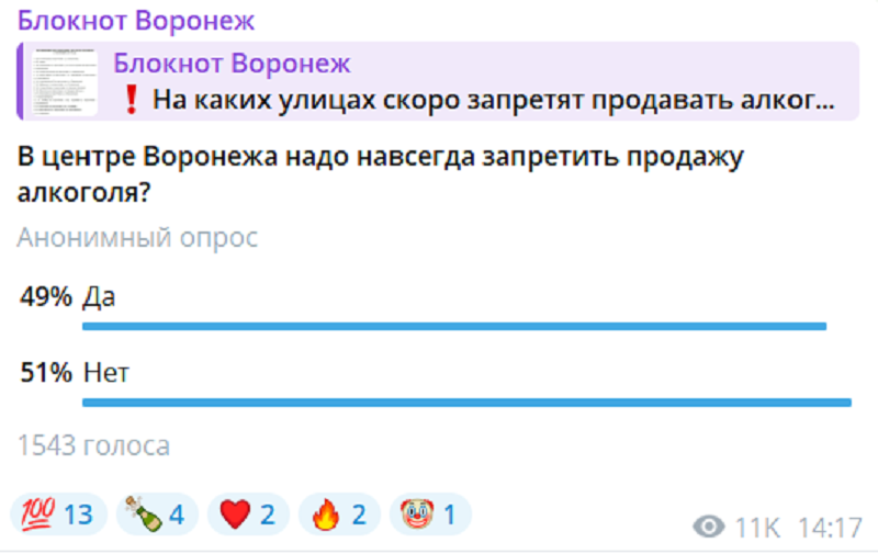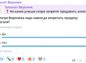 По такому случаю редакция «Блокнота» решила провести опрос в своем телеграм-канале. Чтобы узнать как жители Воронежа относятся к тому, чтобы и вовсе навсегда запретить продажу спиртного в центре города. В опросе поучаствовали 1543 человека. Против запрета выступили всего 51% опрошенных, победив с небольшим перевесом. «За» такой запрет высказались 49% респондентов.