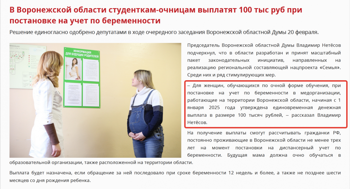 Стоит напомнить, что помимо ежемесячных декретных выплат в 17 тысяч 9 рублей студентки - очницы в нашем регионе имеют право получить 100 тысяч рублей при постановке на учет по беременности. Такое решение было принято Воронежской областной Думой в феврале текущего года, а действовать оно начало с 1 января 2025 года. 100 тысяч рублей - это единовременная выплата, но к ней есть ряд ограничений.