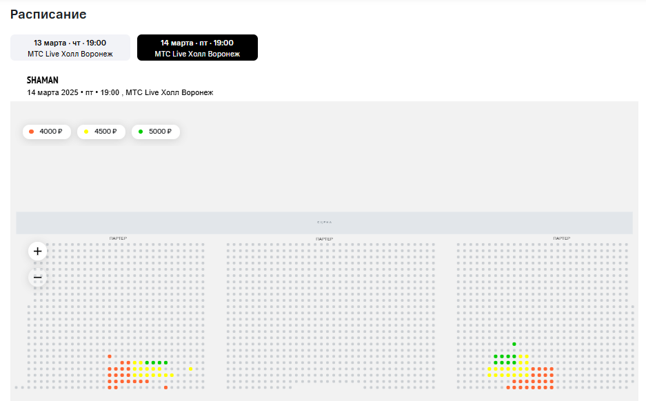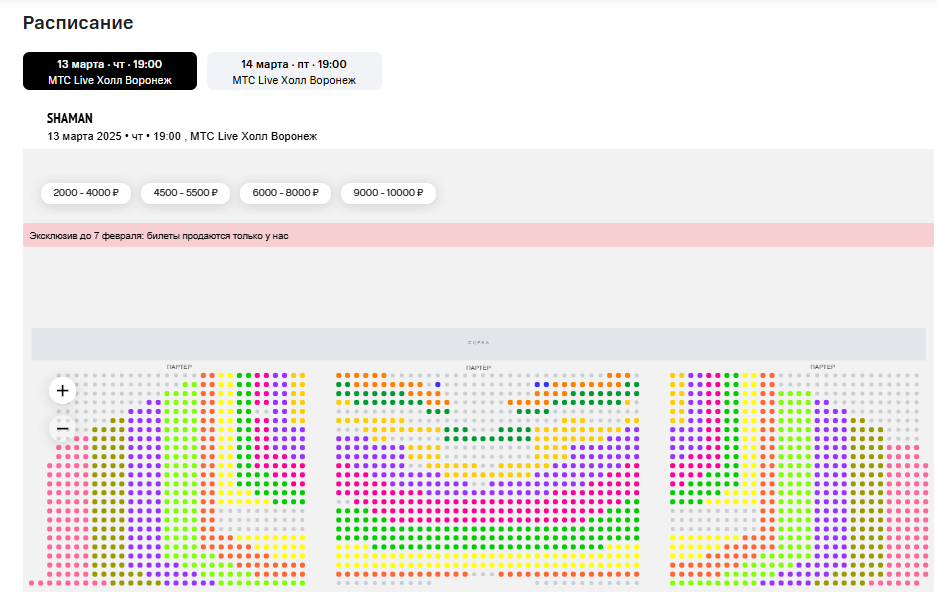 На 13 марта места еще есть. Самый дорогой билет на SHAMAN стоит 10 тыс рублей. Цены начинаются от 2 тыс.