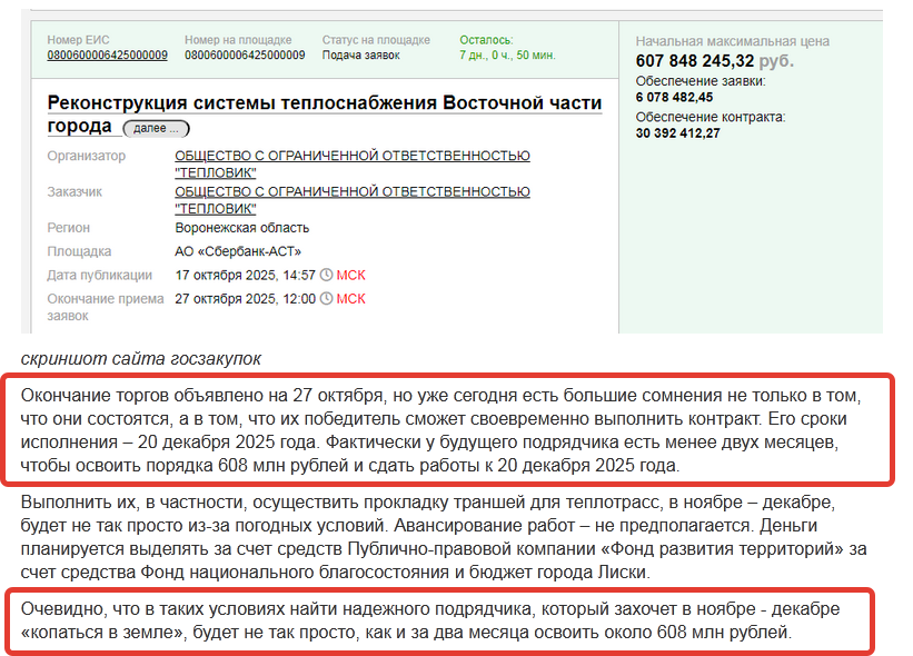 Таким образом, у лискинского ООО «Тепловик» от 1 млрд 86 млн рублей осталось примерно около 600 млн. Этими средствами – федеральными деньгами - заказчик решил провести торги по поиску нового подрядчика.