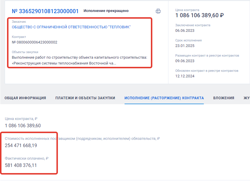 скриншот из карточки исполнения контракта между ООО "Тепловик" и ООО «Южнефтегазстрой»
