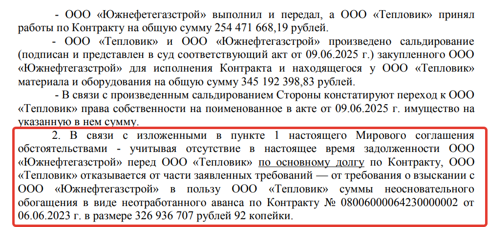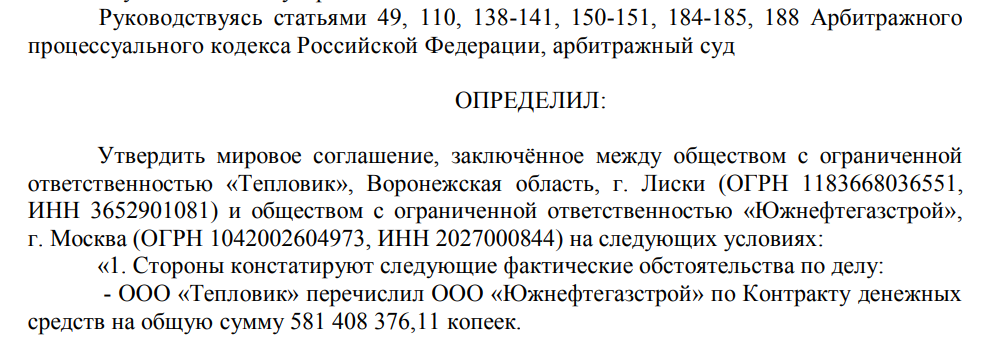 В опубликованном решении Арбитражного суда Воронежской области записано: «Тепловик» перечислил «Южнефтегазстрою» 581,4 млн р по контракту, а подрядчик выполнил и передал заказчику работы на 254,5 млн р., и тот их принял. Образовавшуюся разницу стороны решили «зачесть» в счет ранее закупленного «Южнефтегазстроем» материала и оборудования на 345,2 млн руб. К «Тепловику» перешло право собственности на данное имущество, и компания отказалась от части требований к подрядчику — 326,9 млн руб неотработанного аванса по контракту.