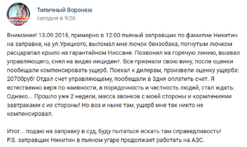 - Ущерб мне так никто не компенсировал. Итог... подаю на заправку в суд, буду пытаться искать там справедливость! Заправщик этот продолжает работать на АЗС, - написал пострадавший автомобилист.