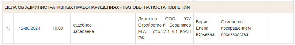 Само заседание было недолгим. После стандартной процедуры с перечислением присутствующих участников процесса судья Татьяна Литовкина огласила копию постановления о привлечении к административной ответственности и административного наказания в отношении Бердникова – директора ООО «СУ СТРОЙРЕГИОН».