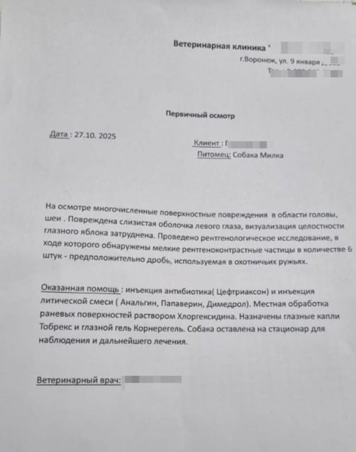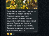 По итогам поездки в клинику стало известно, что неизвестный стрелял из дробовика, вся голова Милки была в мелкой дроби, это показало рентгеновское исследование. Глаз задет, но не выбит, поэтому специалисты не стали его удалять.
