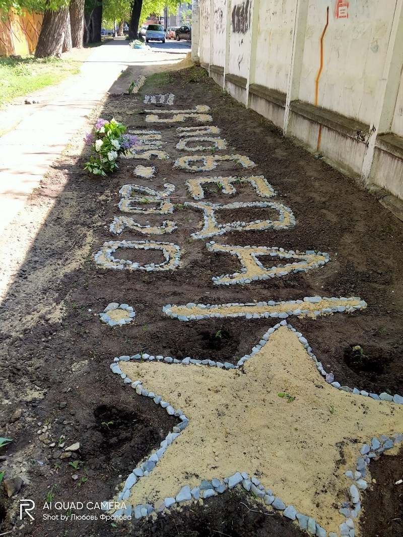 На воронежских ваях кто-то на месте мусорки обустроил территорию. Собрав отходы, которые валялись вдоль высокого забора, неизвестный аккуратно разграбил территорию и выложил на ней из декоративного щебня фразу: «75 Победа 1945-2020». Ее он дополнил образом флага и звезды. А, чтобы получилось еще ухоженнее и красивее, каждый элемент неизвестный засыпал желтым песком.