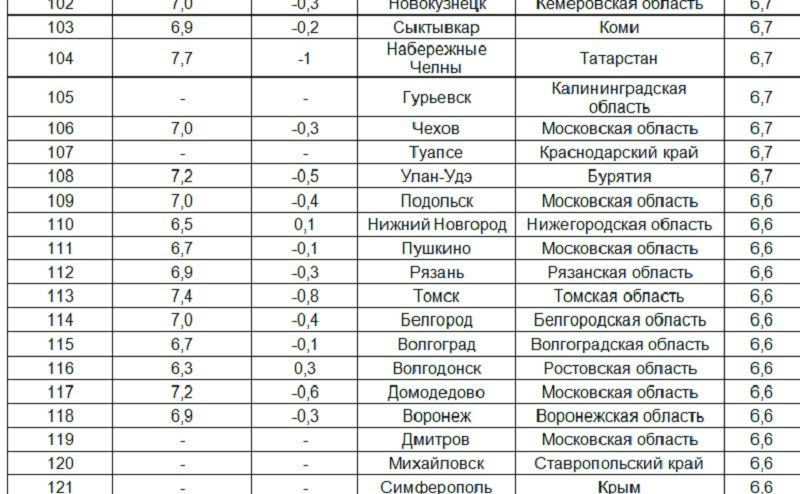 В итоге Воронеж оказался на неприглядном 118 месте. За год столица Черноземья потеряла 0,3 балла – рейтинг составил 6,6 балла. Рядом с Воронежем в таблице оказались такие города как: Волгодонск, Волгоград, Домодедово и Дмитров.