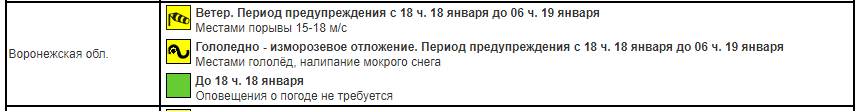 Отметим, в Воронежской области в настоящее время действует желтый уровень погодной опасности. С 18 часов 18 января до 6 часов 19 января будет наблюдаться гололедно-изморозевое отложение, местами гололед, налипание мокрого снега.