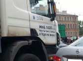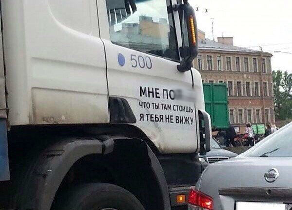– Мне (все равно), что ты там стоишь. Я тебя не вижу, – написано на двери фуры.