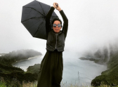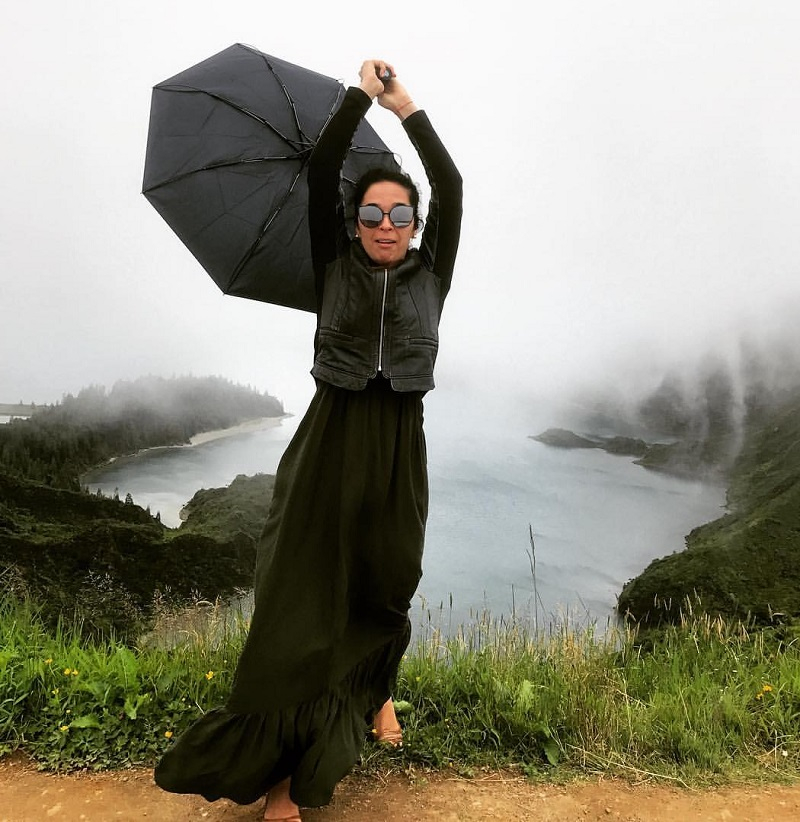 На фотографии девушка позирует на камеру на фоне живописного пейзажа в Португалии. Юмористка предстала в готичном образе,черных очках и с таким же черным зонтиком. По всей видимости, задача стояла сделать атмосферные, мрачно-красивые фотографии. Но порыв ветра внес свои коррективы – зонтик вывернуло наизнанку, и на лице Юлии, пытавшейся его удержать, застыло забавное выражение.