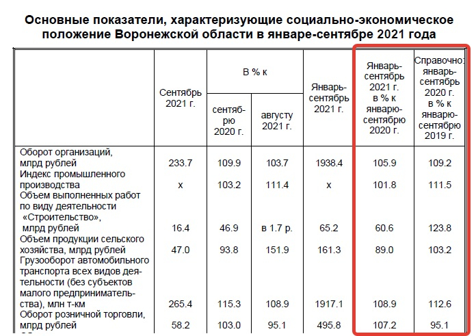 По данным Воронежстата, темпы развития экономики (за 9 мес 2020 г по сравнению с аналогичным периодом 2019 г) были на десятки процентов выше, чем сейчас.