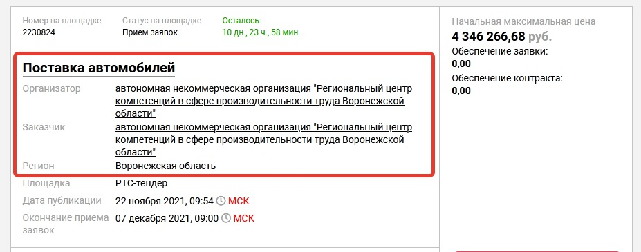 Сразу четыре легковых автомобиля общей стоимостью не менее 4,3 млн рублей желает приобрести Автономная некоммерческая организация «Региональный центр компетенций в сфере производительности труда Воронежской области».