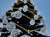 Из украшений на елке выделяются большие светящиеся шары.